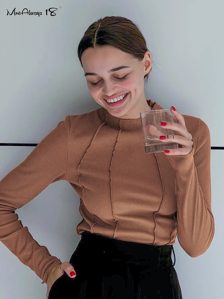 Mnealways18, коричневые вязаные топы, Женская облегающая футболка с оборками и длинным рукавом, однотонные базовые Топы, плиссированные женские ...