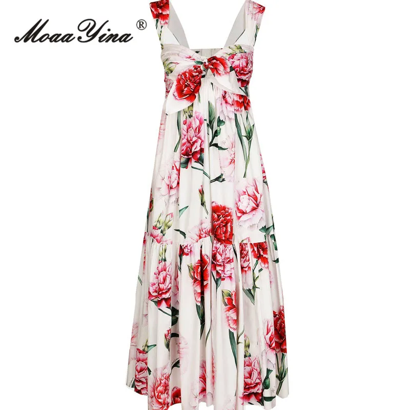 MoaaYina, летнее, модное, дизайнерское, винтажное, Хлопковое платье, женское, квадратный воротник, открытая спина, бант, цветочный принт, свободное платье на бретельках, длинное платье