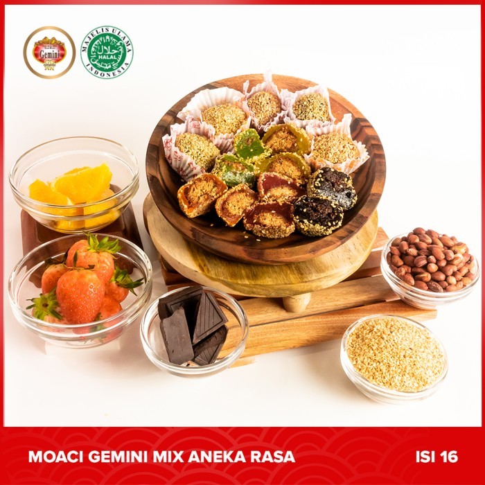 Kueh Moaci kenyal dengan taburan kacang wijen yang membuat moaci gemini memiliki citarasa khas dan menjadi oleh-oleh dari Semarang yang paling diminati Moaci gemini variant Aneka rasa memiliki 5 rasa asli buah - buahan (Pandan, Cokelat, Jeruk, Durian,dan Strawberry) pada balutan adonan nya, untuk isian tetap kacang tanah.