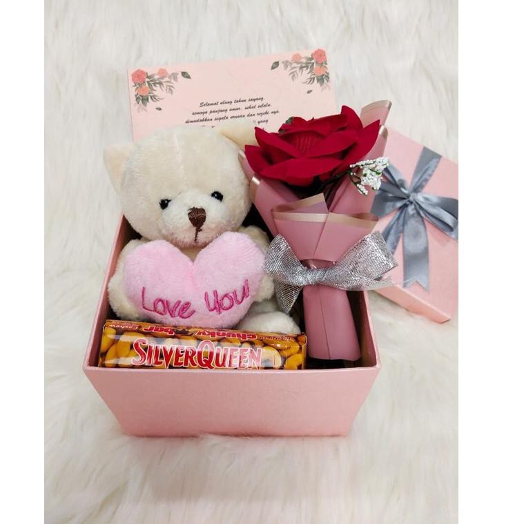 Selamat Datang di toko online kami :) Produk Terlaris kami sudah restock Pasti sudah tahu kan Kado Ulang Tahun Cewek Hadiah Anniversary Kado Valentine Kado Ulang Tahun kesukaan kalian semua ini? Murah READY STOCK BISA LANGSUNG KIRIM + FREE UCAPAN Real Picture !!! ( barang produksi sendiri ) Pembayaran sebelum jam 14.00 barang bs dikirim di hari yang sama ) BONEKA SNI Free PACKING DUS & BUBBLE WRAP untuk melindungi barang saat pengiriman Perfect Gift ID punya solusinya nih ❤️ Produk ini cocok untuk hadiah Ultah, hadiah anniversary, hadiah wisuda, dll Rincian barang : Ukuran box : 15x15x11cm Boneka beruang ada 2 variasi : 1. Boneka coklat tua love you 2. Boneka gold love you 3. Boneka putih love you 4. Boneka pink love you 1. Boneka Pita coklat tua 2. Boneka Pita gold 3. Boneka Pita putih 4. Boneka Pita pink Buket Bunga Artificial ( bunga tiruan sangat mirip asli, jadi awet juga ya bisa disimpan terus ❤️) Coklat Silverqueen chunky bar 33g (optional bisa pakai/gak ) Ada pilihan 2 variasi : 1. Tanpa Coklat : box pink isi boneka love, bunga, dan kartu ucapan 2. Pakai Coklat : box pink isi boneka love, bunga, kartu ucapan, dan coklat Silverqueen chunky bar 33g boneka bungaboneka Untuk pemesanan jika ada opsi warna dimohon untuk memberikan keterangan warna. Terima Kasih >>>> MEMBELI SAMA DENGAN SETUJU