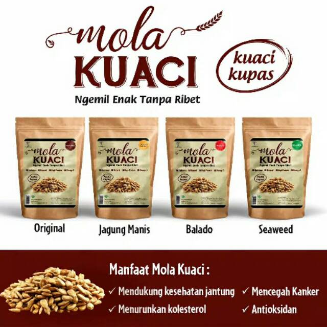 Mola produsen Snack Sehat buatan Indonesia. Setelah sukses dengan produk Mola Granola dan Mola Cookies. Sekarang tersedia Snack Mola Kuaci, Snack Enak, High Protein, Omega 3 dan Halal.