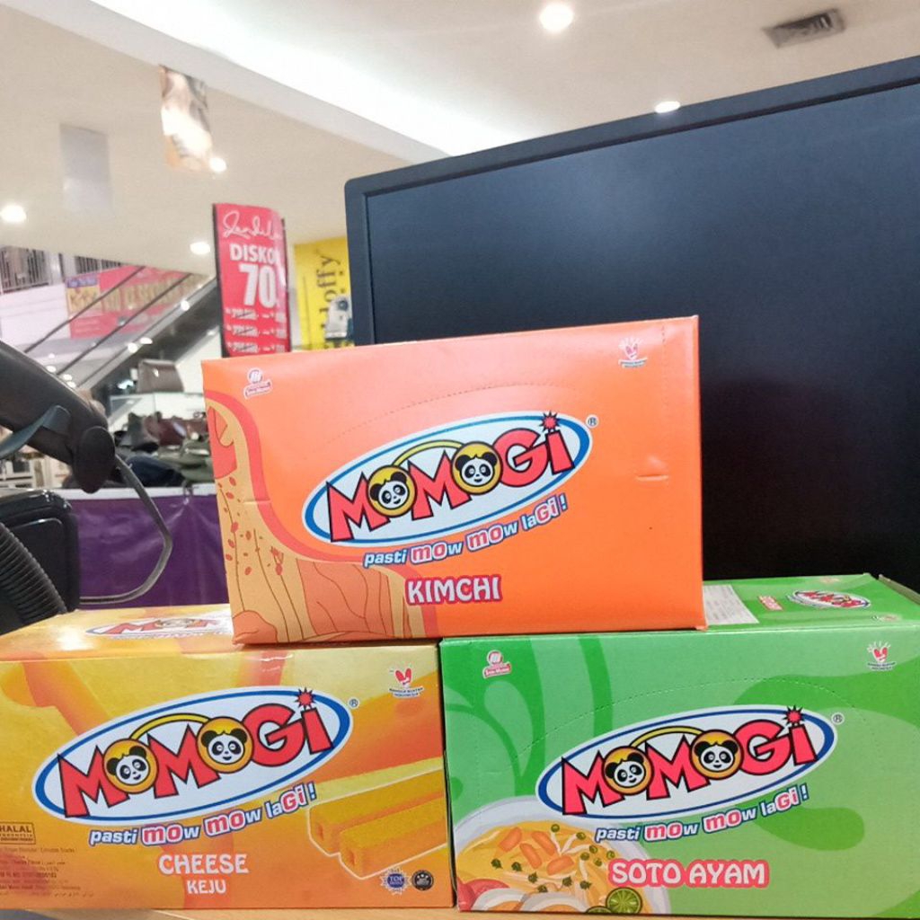 Momogi adalah camilan stik jagung renyah yang tersedia dalam berbagai rasa, termasuk soto ayam, keju, dan kimchi. Momogi soto ayam menawarkan rasa sup ayam yang kaya rempah dalam bentuk stik yang praktis. Momogi keju memiliki rasa gurih dan asin yang khas keju, sementara Momogi kimchi menghadirkan sensasi pedas dan asam khas kimchi Korea.