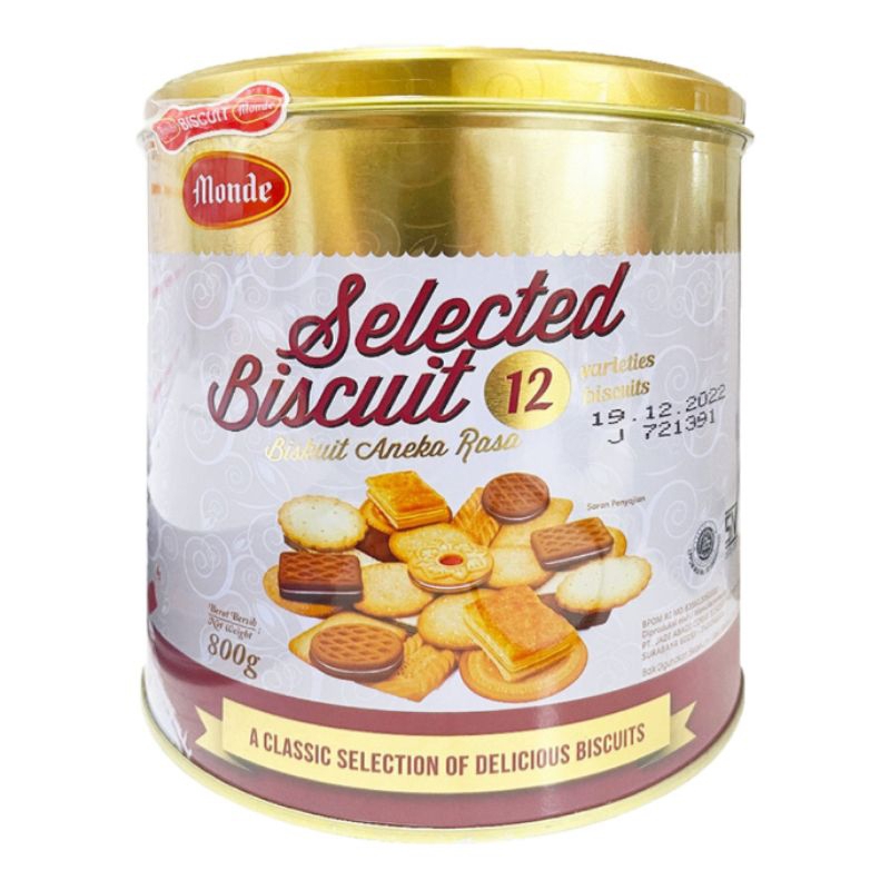 Monde Selection Biscuit Gold Assorted 800 g adalah biskuit aneka rasa dengan 12 varian biskuit didalam kemasan kaleng. Cocok untuk disajikan untuk momen kebersamaan bersama teman dan keluarga. Tersedia dalam kemasan kaleng 800 g