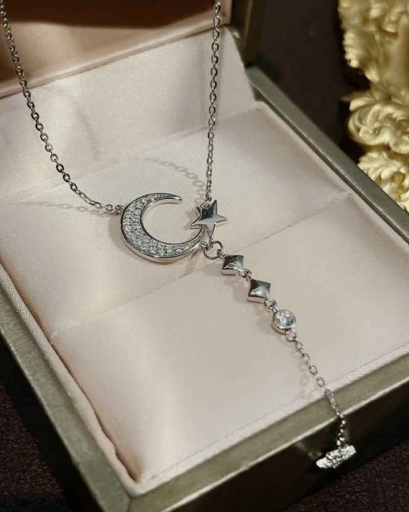 Moon Star Pattern Rhinestone Chain Necklace, Silver