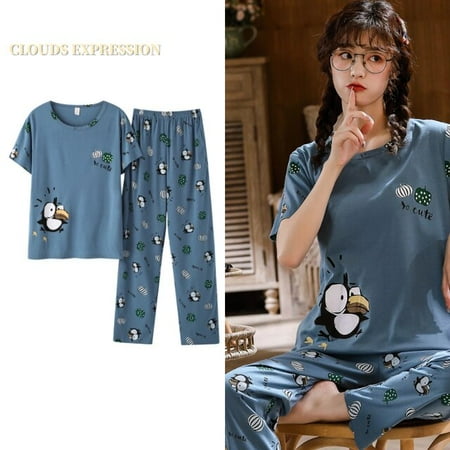 QWZNDZGR Spring Summer Knitted Cotton Cartoon Women s Pajama Sets Short Sleeved Long Pants Plaid Sleepwear Kwaii Nighty 4XL Home Fashion
