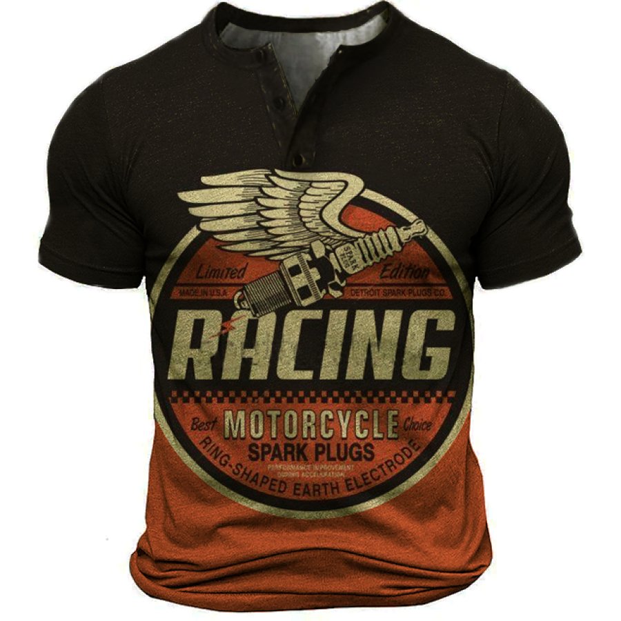 Motorcycle Racing Spark Plug Men's Print Henley Collar T-Shirt