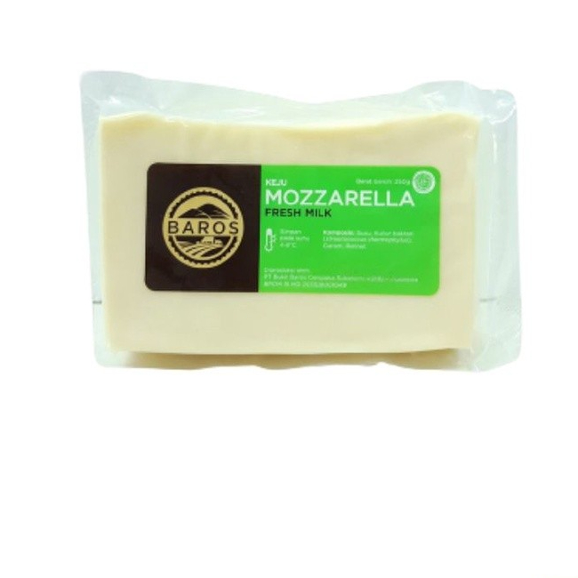 Keju Mozarella Baros berkualitas dari merek lokal.Produk ini telah Halal MUI.