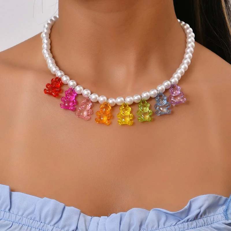 Trendy Colorful Bear Pendant Pearls Pendant Necklace for Women Fashion Jewelry Gift
