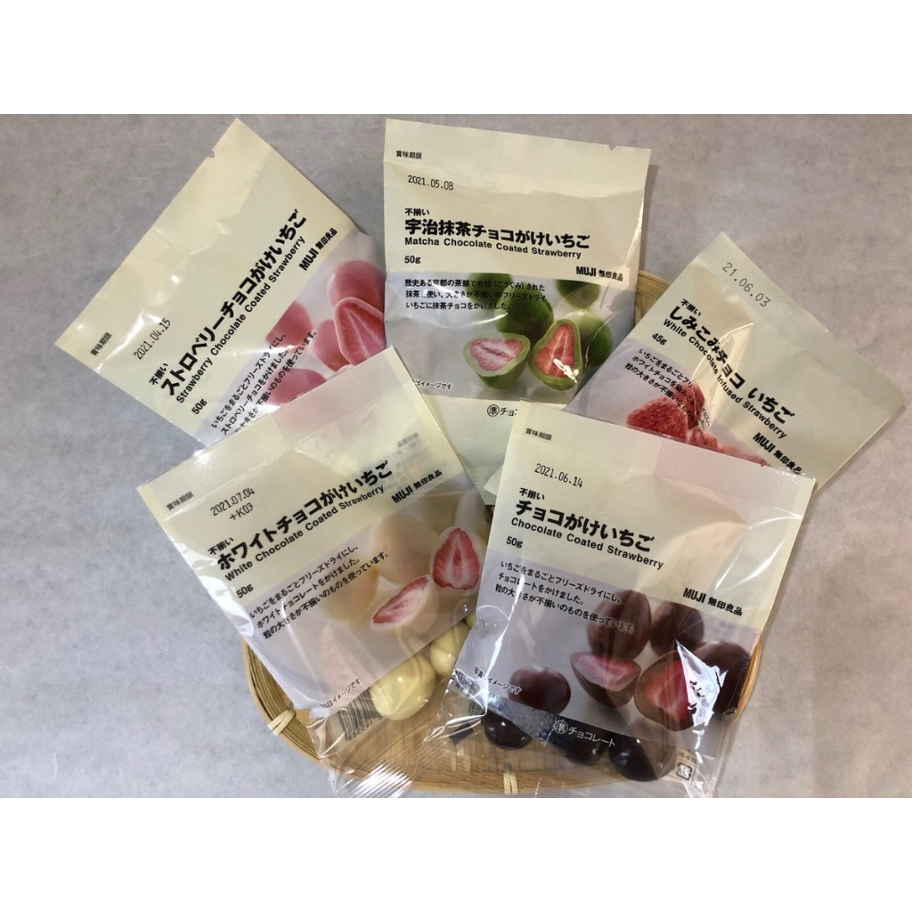 Muji chocolate coated (stroberi lapis cokelat) adalah produk dari Muji yang menawarkan stroberi utuh yang dilapisi dengan berbagai jenis cokelat, seperti cokelat biasa, cokelat putih, atau cokelat matcha.