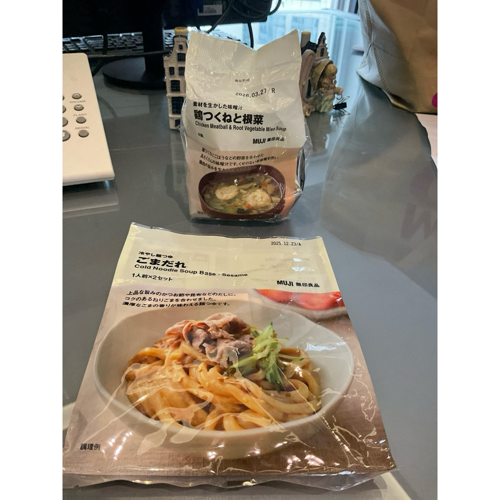 Deskripsi: Sup miso instan yang berisi bola daging ayam (tsukune) dan sayuran akar seperti wortel dan lobak.