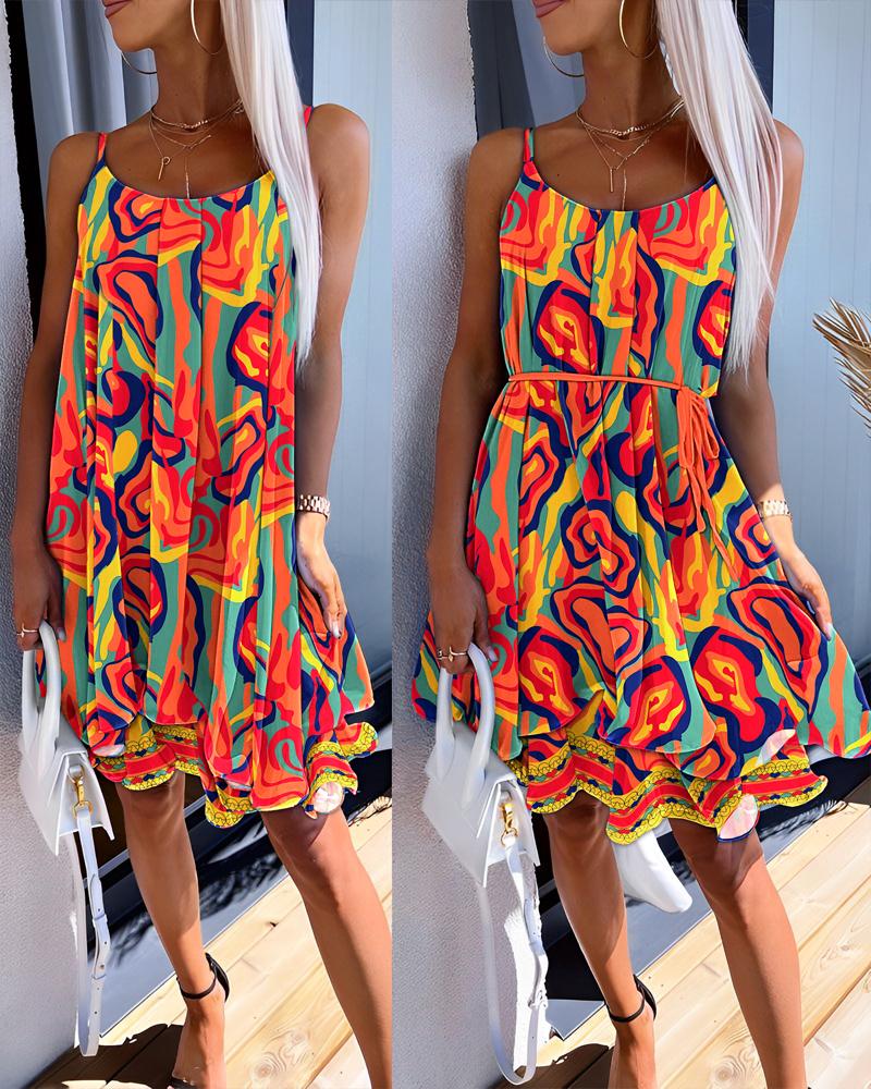 Multi-Color Abstract Print Layered Ruffles Dress, Orange