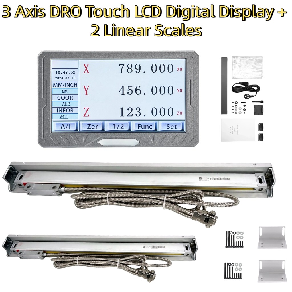 Multilingual 3 Axis LCD Full Touch Screen Digital DRO Kit SDS200S Readout Display & 2PCS 5um Linear Glass Scale Ruler