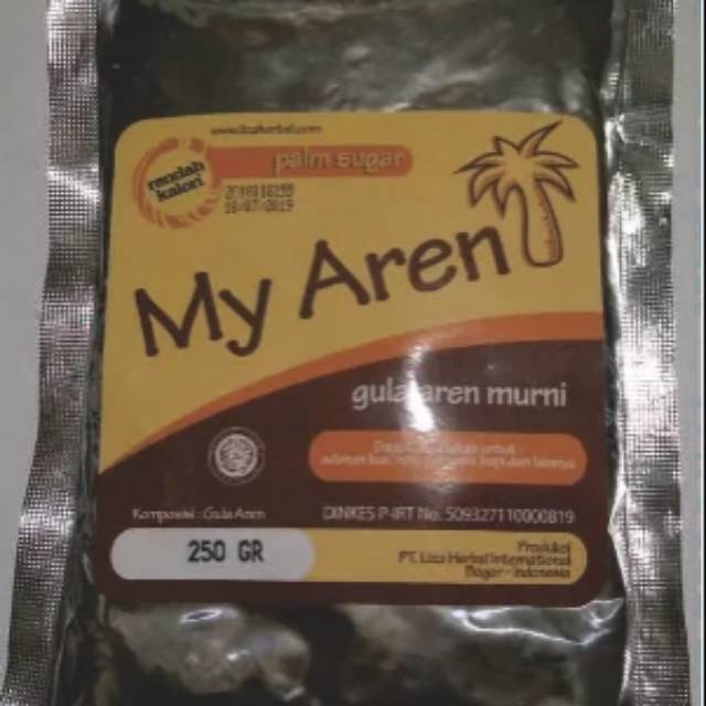 My Aren Natural Diet Sugar (Gula Diet Alami) merupakan pemanis alami terbuat dari Nira Aren alami dan organik. My Aren diproses secara higienis dan alami dari sejak persiapan penyadapan Nira Aren sampai kepada proses pembutiran gula yang di sebut sebagai gula semut (palm zuiker) sehingga mudah digunakan untuk berbagai keperluan seperti layaknya gula pasir. My Aren di produksi tanpa memakai zat kimia sintetis maupun pewarna buatan. My Aren telah melalui Uji Laboratorium Balai Besar Industri Agro (BBIA) Dinas Perindustrian dan terdaftar di Dinas Kesehatan : DINKES PIRT No. 209327108634 serta Halal MUI.