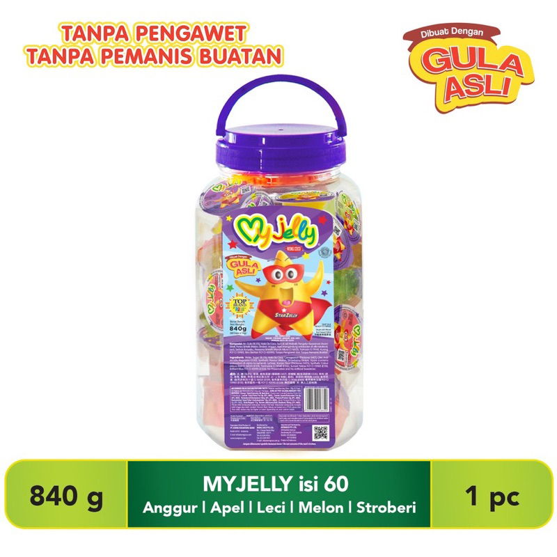 MyJelly merupakan Jelly yang dibuat dengan rumput laut dan Nata de Coco untuk melengkapi cita rasanya. Dipadukan dengan perisa buah-buahan seperti anggur, leci, melon, jeruk dan stroberi dengan gula asli tanpa pemanis buatan dan tanpa bahan pengawet. Disajikan dalam cup 14g yang berbentuk bintang yang membuatnya menyenangkan bagi si kecil. Hadir dalam kemasan toples lebih besar yang dapat dijadikan wadah untuk disimpan dirumah