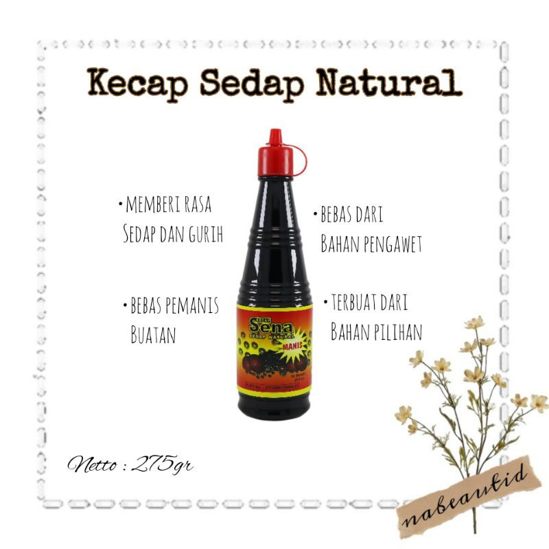 KECAP SENA merupakan kecap sedap yang terbuat dari biji kedelai hitam pilihan, gula aren, garam dan bahan – bahan pilihan lainnya serta rempah – rempah yang bermutu dari alam Indonesia yang diproses secara tradisional. KECAP SENA adalah kecap organik tradisional yang dibuat dari bahan-bahan alami organik tanpa menggunakan zat pengawet, pewarna ataupun zat tambahan. Kecap ini diproduksi dari kedelai hitam, gula, hingga garam organik pilihan