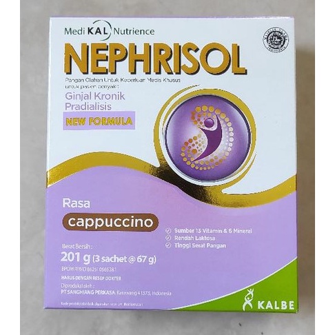 Nephrisol adalah pangan olahan untuk keperluan khusus yang diformulasikan untuk pasien gangguan ginjal kronik pada tahap sebelum dialisis (cuci darah). Dilengkapi dengan 13 vitamin dan 6 mineral. Rendah laktosa, tinggi serat pangan.
