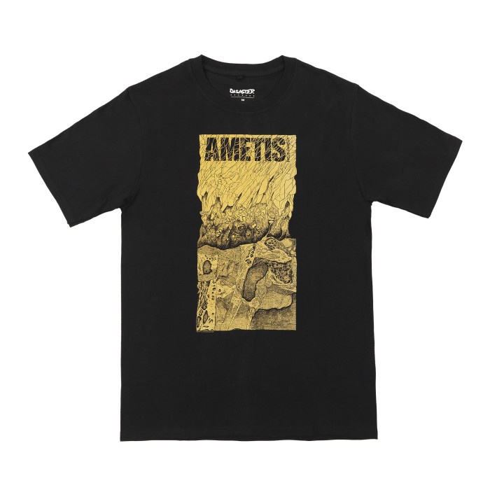Screenprinted on seamless 20s black cotton T-shirt with shimmer gold plastisol ink.