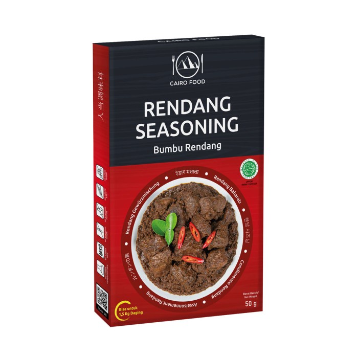 - Bumbu Rendang Cairo Food mengandung: Bawang Merah, Cabai Merah, Biji Ketumbar, Lengkuas, Serai, Bawang Putih, Jahe Putih, Lada Hitam, Kayumanis, Biji Pala(1.5%), Kelapa Kering, Bunga Lawang, Daun Jeruk Purut, Cengkeh, Kapulaga Hijau, Kapulaga Putih, Beras(0.4%), Daun Laurel