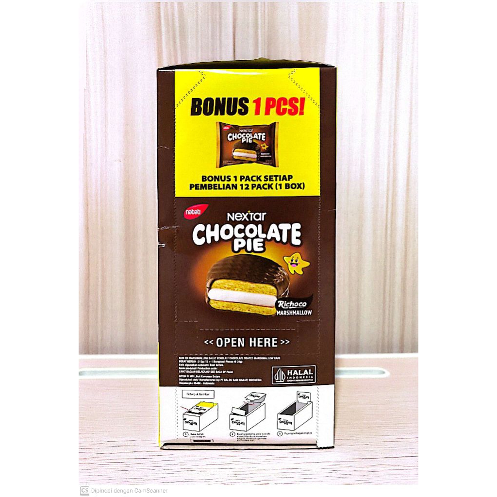 Nextar Chocolate Pie adalah camilan biskuit yang diisi dengan selai cokelat, biasanya dengan lapisan marshmallow di bagian dalam dan dilapisi cokelat di luar. Biskuitnya lembut, dan isian cokelatnya memberikan rasa manis dan kaya. Nextar Chocolate Pie populer sebagai camilan praktis dan lezat, baik dinikmati sendiri maupun bersama keluarga