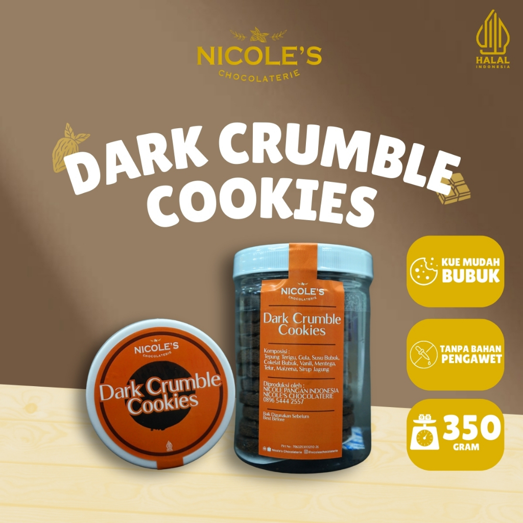 Camilan cokelat istimewa untuk pecinta rasa dark yang intens!Dark Crumble Cookies kami dibuat dengan dark chocolate premium, menghasilkan cookies dengan tekstur renyah di luar, lumer dan crumbly di dalam. Cocok dinikmati bersama kopi atau teh, jadi teman me time maupun suguhan spesial!