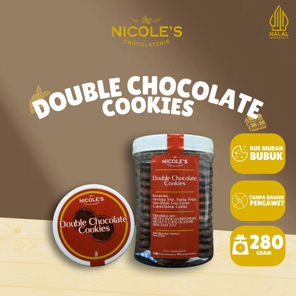 Double Chocolate Cookies hadir dengan rasa cokelat yang super rich dan tekstur cookies yang renyah di luar, lembut di dalam. Dibuat dari bahan berkualitas seperti cokelat bubuk premium dan potongan cokelat asli yang meleleh di mulut, menjadikan setiap gigitan penuh kenikmatan!