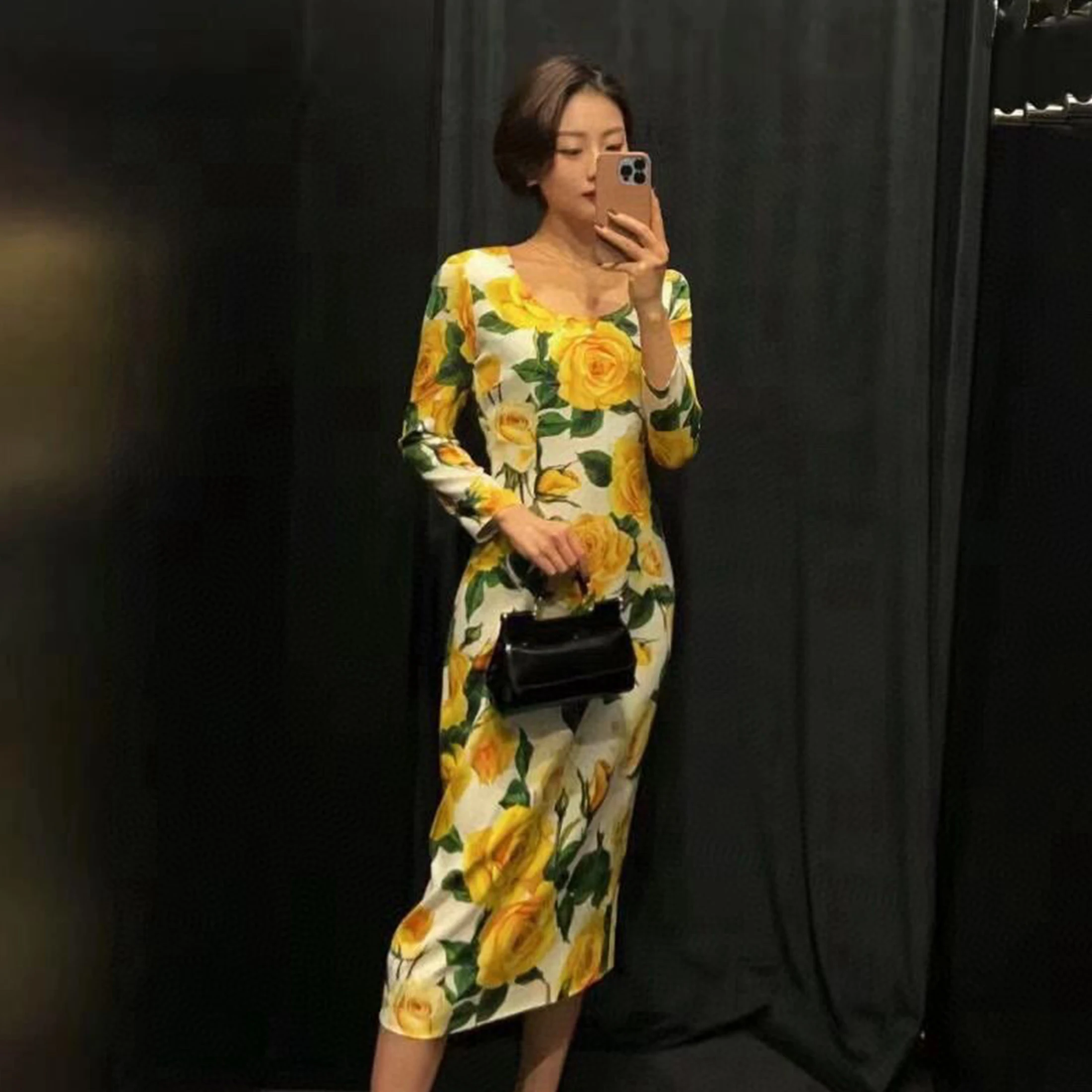 2023 Autumn and Winter New Versatile Commuting Women's Clothing Stripe Printed Round Neck Long Sleeve High Waist A-line Dress