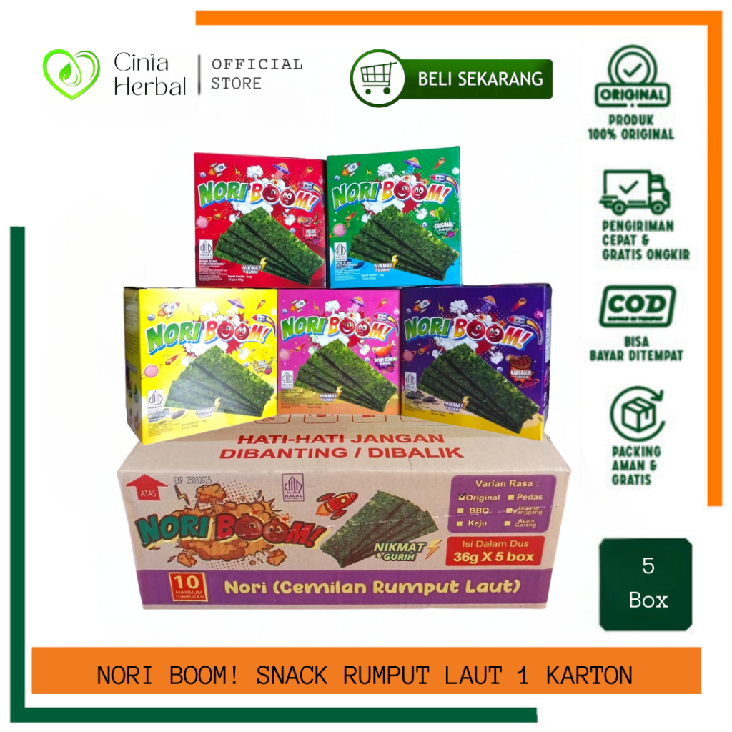 NORI BOOM! Rumput Laut Panggang 5 Varian Rasa I Noriboom Snack Rumput Laut Per Karton Isi 5 Box