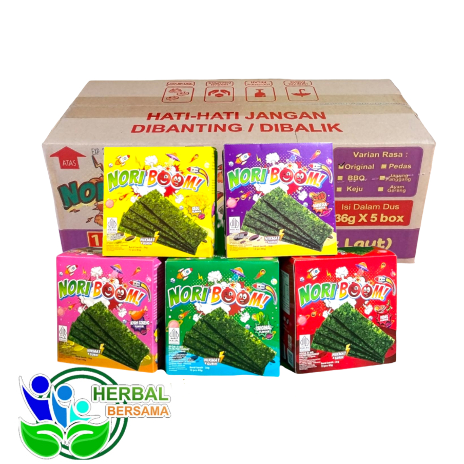 NORI BOOM! Rumput Laut Panggang 5 Varian Rasa I Snack Rumput Laut Per Karton Isi 36gr x 5 Box