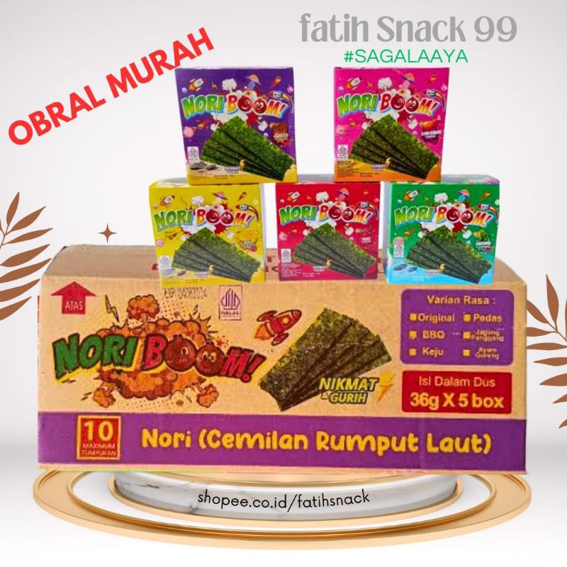 Nori Boom adalah camilan rumput laut yang lezat dan renyah, seringkali dikemas dalam bentuk lembaran tipis yang bisa dimakan langsung atau sebagai tambahan pada hidangan. Produk ini dikenal dengan rasa gurih dan tekstur renyah, serta tersedia dalam berbagai varian rasa seperti original, pedas, BBQ, ayam goreng, dan keju.