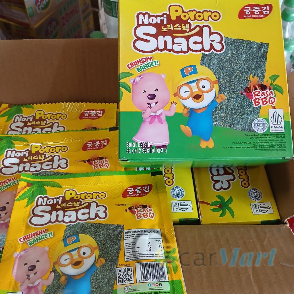 Nori Pororo adalah camilan rumput laut (nori) panggang yang berasal dari Korea, dikemas dengan gambar karakter Pororo yang populer di kalangan anak-anak. Produk ini memiliki tekstur tipis, renyah, dan rasa gurih serta asin. Nori Pororo juga memiliki kandungan nutrisi seperti vitamin dan mineral, serta rendah kalori dan tinggi serat.