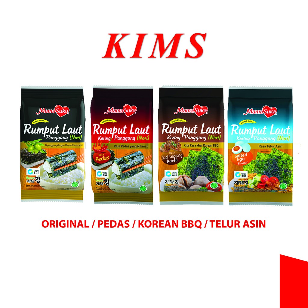 Rumput Laut Kering Panggang MamaSuka merupakan bahan makanan, berupa lembaran rumput laut yang dipanggang 2 kali dengan minyak zaitun, minyak jagung, dan minyak wijen kemudian ditaburi garam halus. Makanan ini kaya serat, vitamin dan mineral serta rendah kolesterol, karena rumput laut punya manfaat baik untuk kesehatan. Salah satunya meningkatkan kesehatan jantung berkat kandungan asam lemak omega-3 dan antioksidan untuk meningkatkan kesehatan jantung.