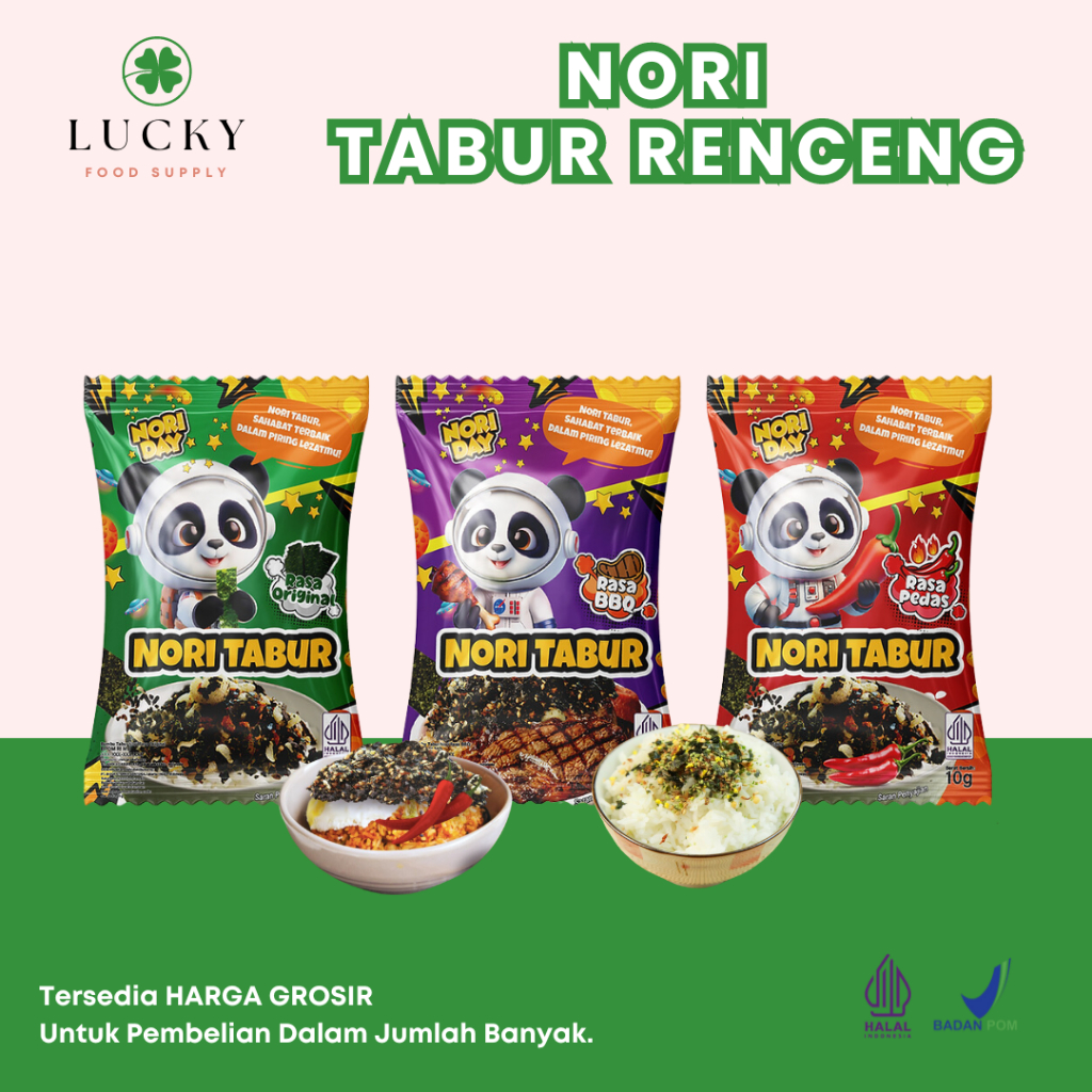 Nori Tabur adalah makanan ringan / cemilan rumput laut yang dapat diaplikasikan ke berbagai makanan seperti Nasi Hangat, Mie Instant, Bubur, Nasi Goreng dan berbagai makanan lainnya.
