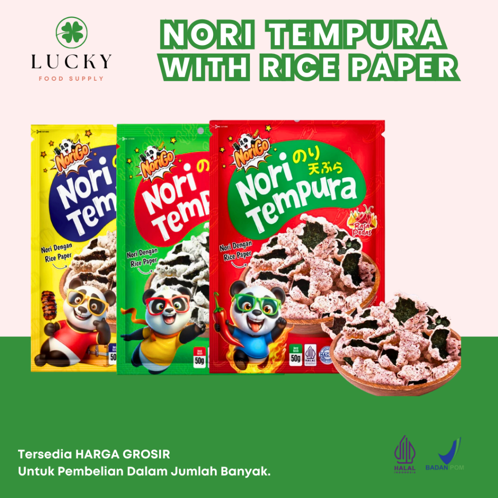 Norigo Nori Tempura adalah cemilan renyah asal Jepang yang terbuat dari rumput laut (nori) yang dilapisi dengan adonan tempura dan digoreng hingga garing. Camilan ini memiliki tekstur yang crispy dengan perpaduan rasa gurih dari rumput laut dan renyahnya tempura. Biasanya, Norigo Nori Tempura juga ditambahkan bumbu-bumbu seperti garam, rumput laut bubuk, atau bahkan bubuk cabe agar lebih lezat dan memiliki rasa yang bervariasi.
