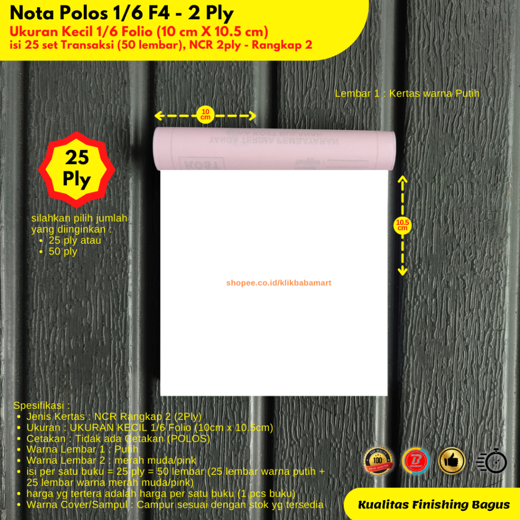 Ukuran Kertas KECIL 1/6 F4 (10cm x 11cm) NCR Rangkap 2Ply