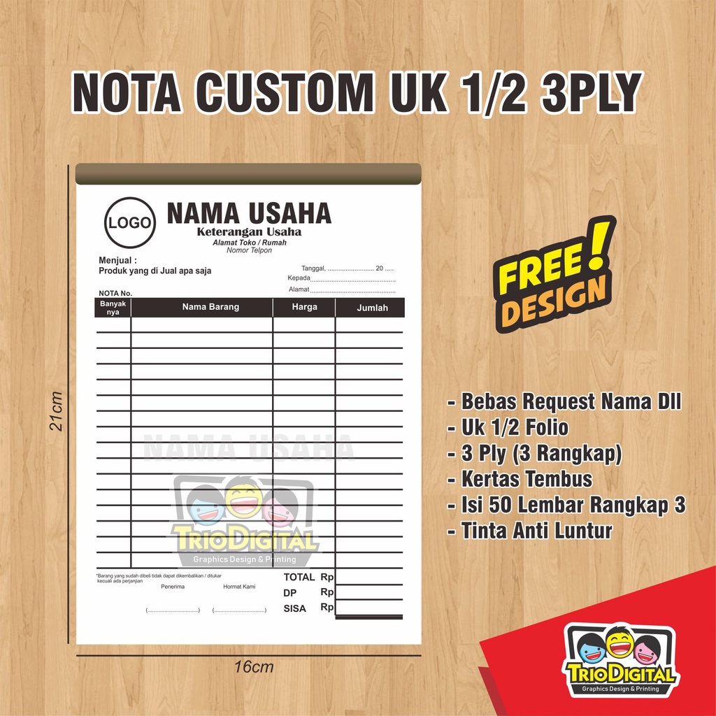 Varian NCR 3ply adalah nota dg bahan kertas NCR rangkap 3. tembus tanpa tambahan karbon