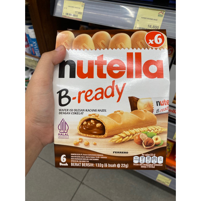 Nutella B-Ready merupakan wafer renyah berisikan cokelat nutella dan kacang hezel serta di atasnya ditaburi gandum krispi. Nutella B-Ready memiliki bentuk yang praktis dan mudah dimakan di mana saja, tersedia dalam kemasan satuan, dua potong, dan enam potong aman untuk dikonsumsi anak-anak maupun orang dewasa karena telah bersertifikat halal dan terdaftar di BPOM.