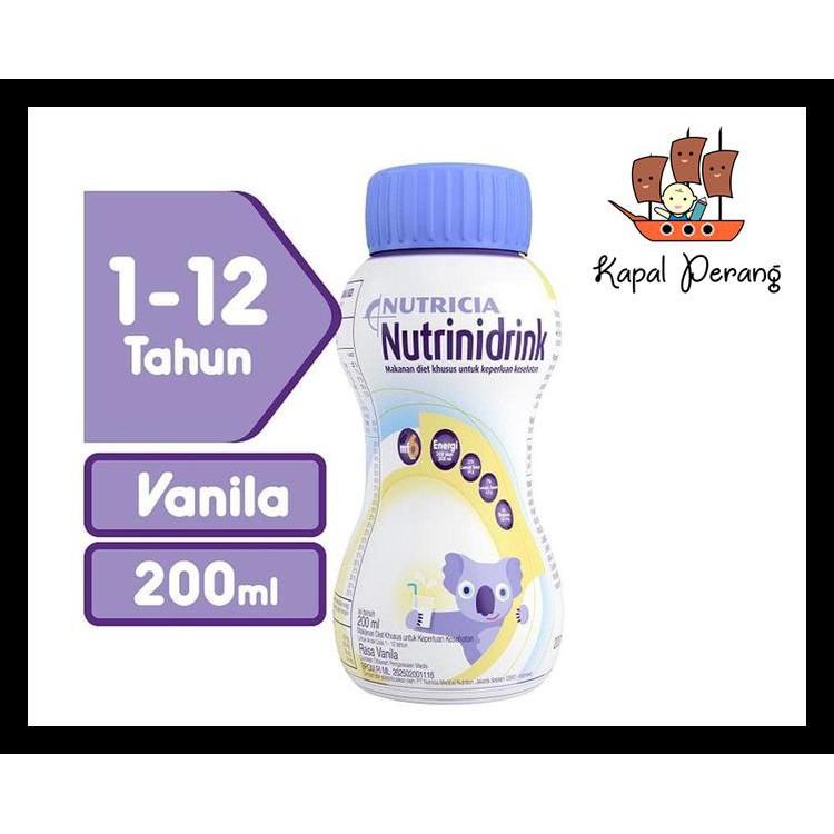 Nutrinidrink Vanilla 200 mL adalah makanan untuk kontrol diet pada anak beresiko gizi kurang, berbahan dasar susu sapi yang bergizi dan mengandung energy 1,5 kkal/ml, protein, 12 vitamin dan 10 mineral untuk anak usia 1-12 tahun. Diformulasikan dengan : Maltodekstrin, Protein susu kasein, Asam Linoleat dan Asam Alpha Linolenat, Multi Fiber, Bebas laktosa.