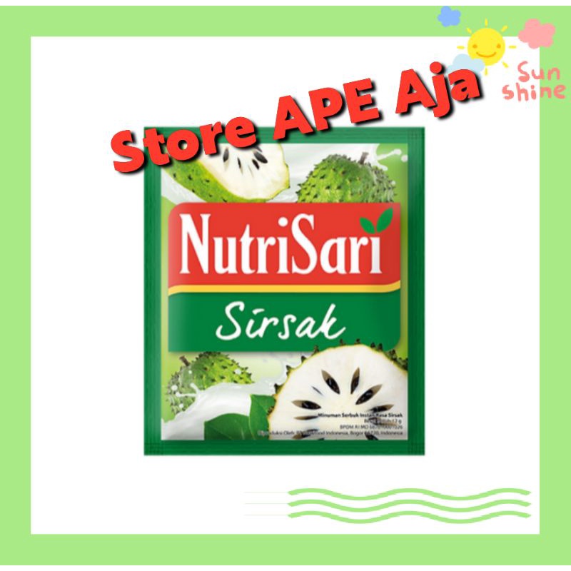 Nutrisari Rasa Sirsak merupakan minuman serbuk dari sari buah sirsak alami. Memenuhi 100% kebutuhan vitamin C, diperkaya dengan vitamin A, B1, B3, B6, asam folat dan E. Diolah dengan teknologi tinggi (granulasi dan enkapsulasi) agar kualitas produk tetap terjaga.