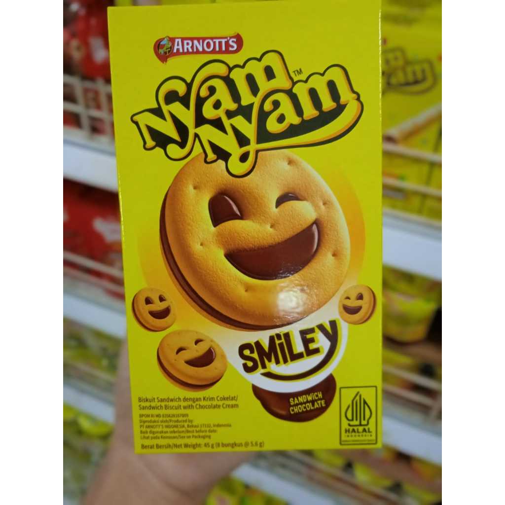 Biskuit sandwich dengan lapisan krim coklat lezat di tengah dari Nyam Nyam. Dengan emoji lucu di setiap kukisnya. Sampaikan ekspresi kamu untuk teman dengan kalimat asik di setiap kemasan Nyam Nyam Smiley 45gr .