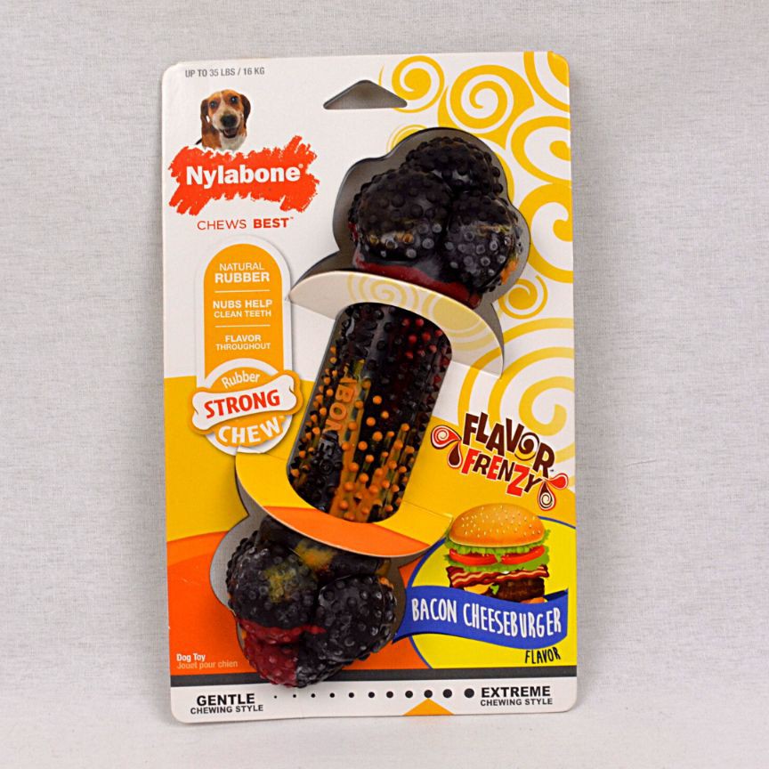 This Product Measures: 8.5L x5.25W x2.3H.DescriptionPowerful chompers have finally met their tasty match with the NylaboneRubberChew Flavor Frenzy Bacon Cheeseburger Flavored Dog Chew Toy. Designed tohold up to tough chewers, this chew toy gives bored dogs something to sink theirteeth into, while the nubs help to clean them—offering two convenient uses inone delicious package. And because your dog is always begging for a bite of yourfood, it’s made to taste just like the real deal. Try a different flavor inevery room!Key Benefits * Non-edible long-lasting dog toy is made to occupy strong chewers to prevent destructive chewing. * Strong chewing style keeps dogs busy, happy, and satisfied with a bacon cheeseburger flavor throughout. * Inspired by the indulgent people food that dogs wish they could eat with zero calories. Try every flavor! * Easy-grip natural-grade rubber is designed for chewers who prefer some flex and give. * Recommended by veterinarians. Helps to promote dental stimulation, which is good for oral health.Every dog plays differently and, since not all toys are created equal, it’salways best to keep a close watch on your pup in case things get ruff.Supervised play will help toys last longer and most importantly keep your palsafe. No dog toy is truly indestructible, so always remove the toy from playtimeif pieces begin to break off.
