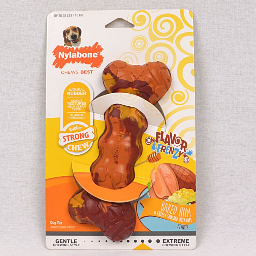 This Product Measures: 8.5L x5.25W x1.55H.DescriptionPowerful chompers have finally met their tasty match with the NylaboneRubberChew Flavor Frenzy Baked Ham & Cheesy Smashed Potato Flavored Dog ChewToy. Designed to hold up to tough chewers, this chew toy gives bored dogssomething to sink their teeth into, while the unique texture help to cleanthem—offering two convenient uses in one delicious package. And because your dogis always begging for a bite of your food, it’s made to taste just like the realdeal. Try a different flavor in every room!Key Benefits * Non-edible long-lasting dog toy made for strong chewers to prevent destructive chewing. * Strong chewing style keeps dogs busy, happy, and satisfied with a ham and cheesy mashed potato flavor throughout. * Inspired by the indulgent people food that dogs wish they could eat with zero calories. Try every flavor! * Easy-grip natural-grade rubber is designed for chewers who prefer some flex and give. * Rrecommended by veterinarians. Helps to promote dental stimulation, which is good for oral health.Every dog plays differently and, since not all toys are created equal, it’salways best to keep a close watch on your pup in case things get ruff.Supervised play will help toys last longer and most importantly keep your palsafe. No dog toy is truly indestructible, so always remove the toy from playtimeif pieces begin to break off.