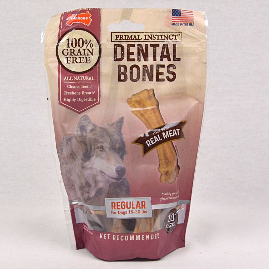 Dog dental care is essential, but not always easy. Let Nylabone Primal InstinctDental Bones do some of the work–naturally.Each treat is crafted to help clean dogs' teeth by engaging their naturalchewing action, leading to cleaner teeth and fresher breath.Made with real meat, these all-natural, highly digestible dental treats satisfyyour dog’s primal instinct to chew.Your pup won’t even know they are practicing healthy oral hygiene while chewingon this delicious meat flavored bone. Each dog chew treat is 100% grain freewith no wheat, no meat by-products, and no corn.This healthy and flavorful dog dental bone is both vet and dog recommended!IngredientsPotato Starch, Vegetable Glycerin, Gelatin, Natural Flavors, Dried Chicken,Calcium Carbonate, Powdered Cellulose, Lecithin.Guaranteed AnalysisCRUDE PROTEIN10.0% minCRUDE FAT0.5% minCRUDE FIBER8.0% maxMOISTURE15.0% max