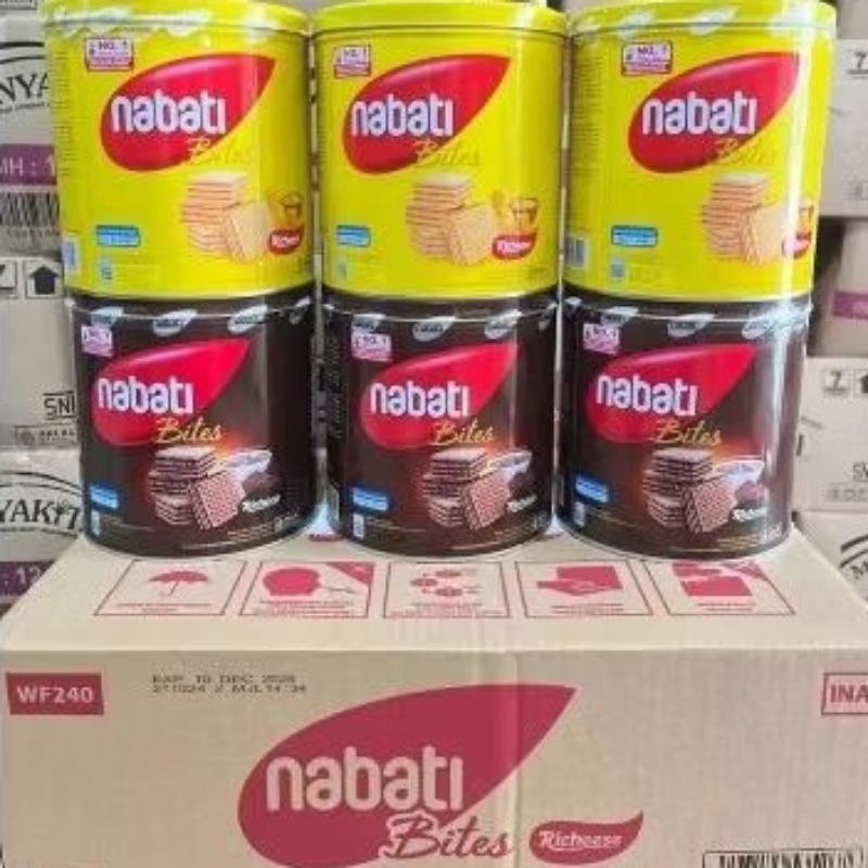 Nabati Bites Kaleng 1 dus isi 6 kaleng. Tersedia varian rasa coklat dan keju.