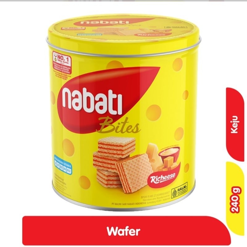 nabati Bites Richeese Wafer Keju Kaleng 240 g merupakan wafer krim keju yang terbuat dari kombinasi keju asli dan bahan-bahan pilihan berkualitas untuk menghasilkan wafer renyah dengan rasa yang istimewa. Richeese nabati terdiri dari kombinasi wafer krispi dan krim keju premium di setiap lapisnya, memberikan Anda sensasi makan keju yang tak terlupakan. Tak hanya itu, wafer nabati ini juga mengandung vitamin A, B1, B2, B6, B12 yang dibutuhkan oleh tubuh, menjadikannya snack lezat yang kaya gizi.