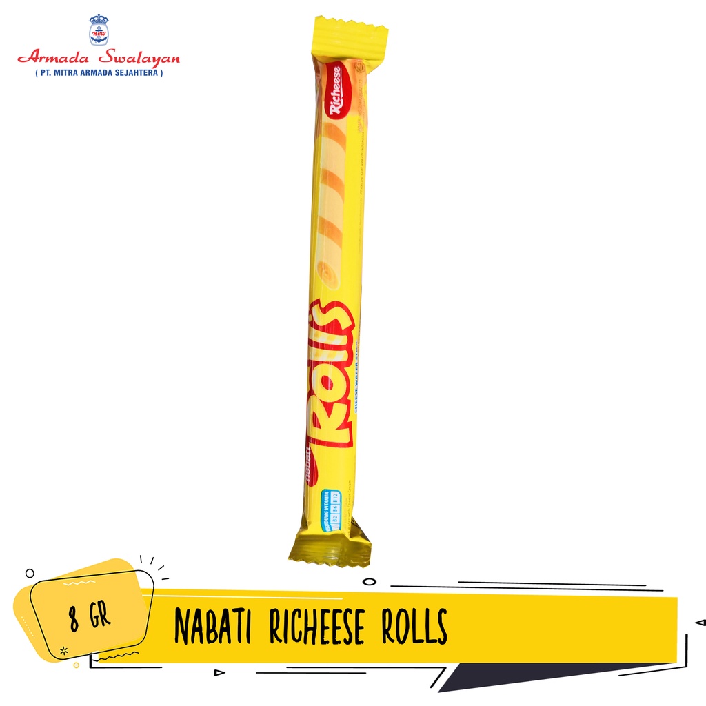 Wafer stick dengan perpaduan crepes yang renyah dan isi krim asli keju berlimpah yang lezat serta mengandung Vitamin A, B1, B2, B6, dan B12. Tersedia dalam kemasan pack 8g yang praktis dibawa dan dinikmati kapan dan di mana saja. Ceriakan suasana santai dan kumpul seru Anda dengan Nabati RicheeseRolls.
