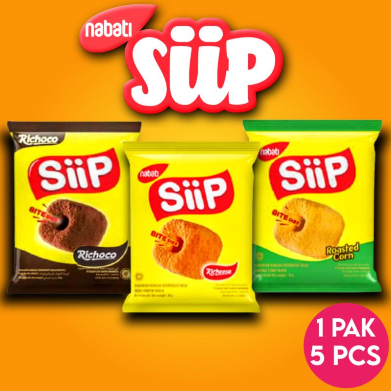 Nabati Snack. SiiP adalah makanan ringan Extrudad berbahan dasar jagung berbentuk stik dan bite size. Dipadukan dengan bumbu berlimpah, sehingga menghasilkan produk yang nikmat, serta dijual dengan harga yang sangat terjangkau. dengan 3Varian coklat, keju, jagung.