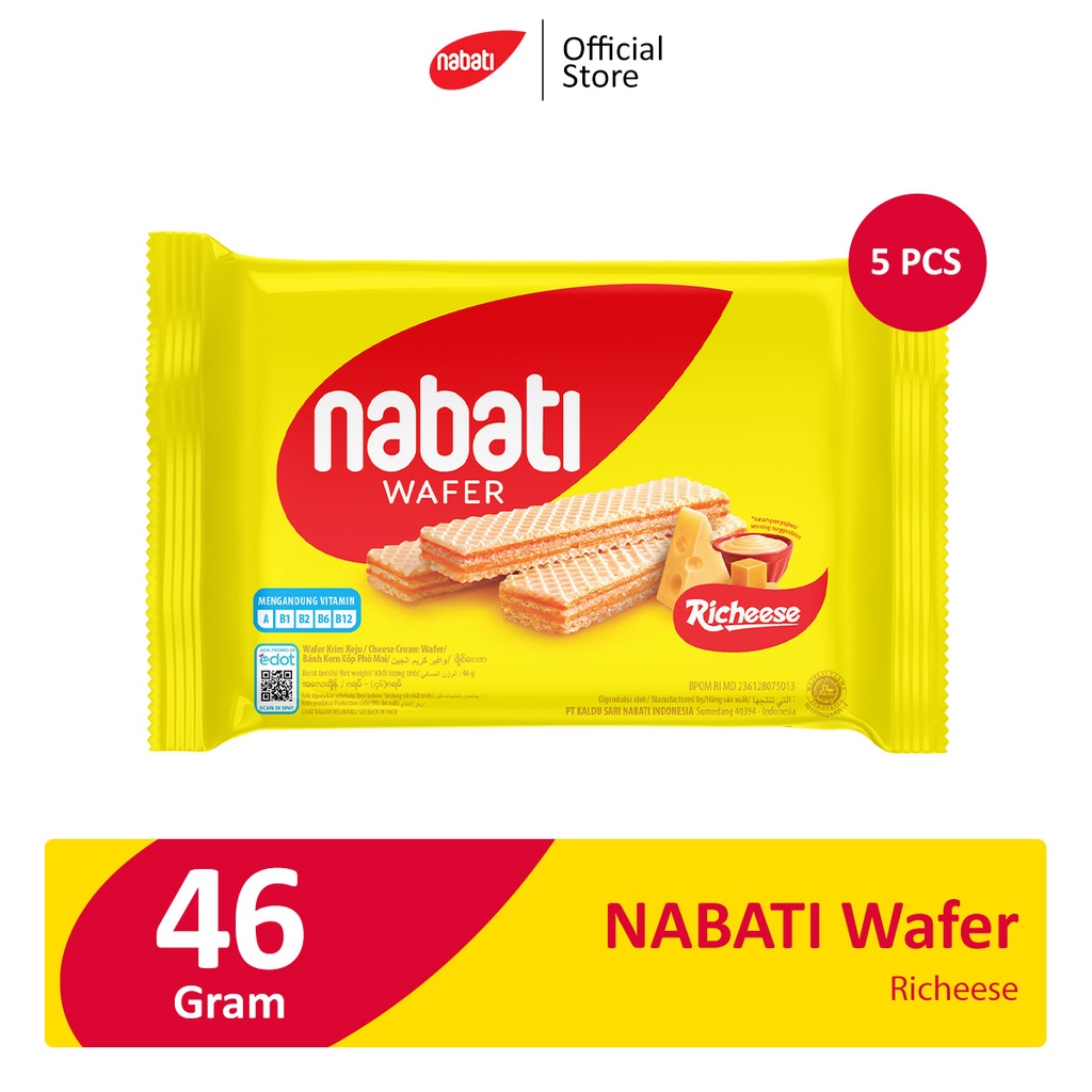NABATI Wafer Richeese 46g - 5 PcsIsi : 5 PcsNABATI Wafer Richeese 7.5g Ini dia NABATI Wafer Richeese! Wafer renyah dengan lapisan krim keju yang mengandung vitamin A1, B1, B2, B6, B12Perhatian :Sangat disarankan agar pembeli dapat merekam video saat pembukaan paket. Tanpa adanya bukti video, akan sangat sulit bagi kami untuk memproses keluhan Anda.