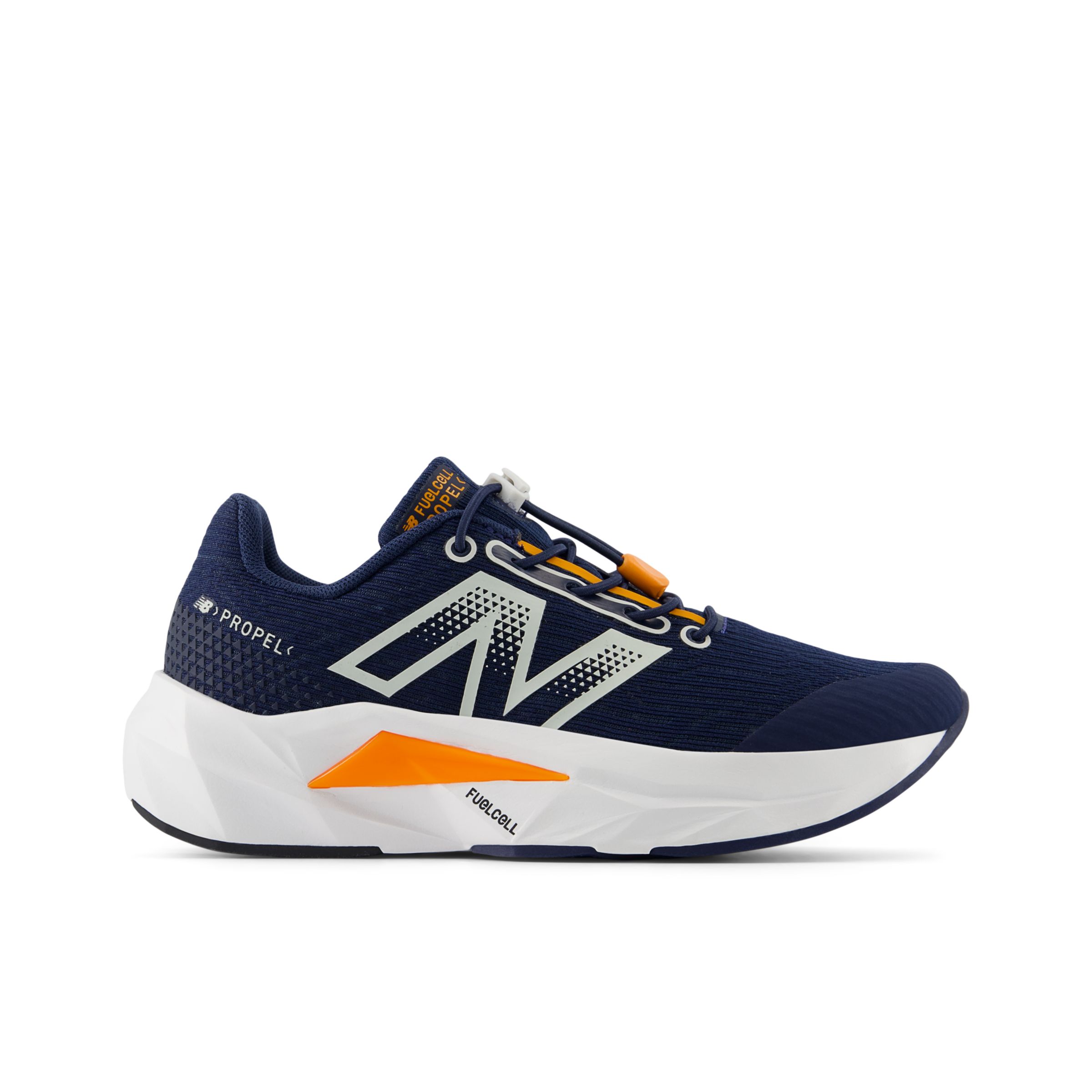 Made for speed, this kids' running shoe has a lightweight feel and an easy-to-use closure, so they can gear up in a flash. | - New Balance Kids' Bungee FuelCell Propel v5 Blue/Orange/Grey - Size: 2 PAFCPRV5-47486
