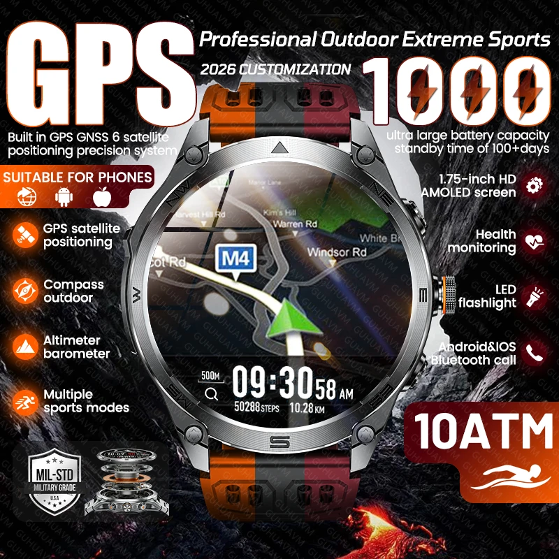 New Military GPS Man Smart Watch Compass 1000mAh Battery 10ATM Waterproof For Android IOS Phones Bluetooth Call Men Smartwatch