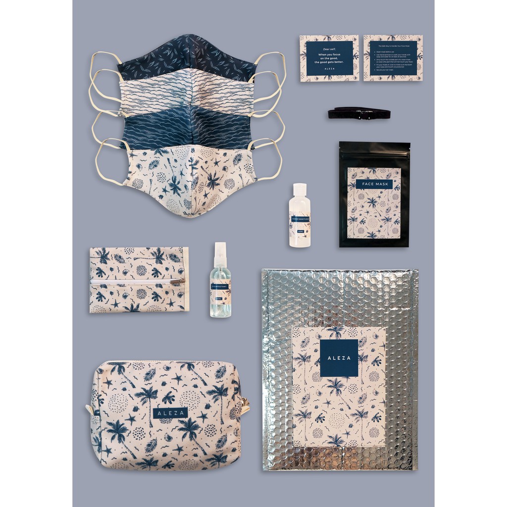 Package comes in;1. 4 Pcs Ear loop Masker ( Packaging black ziplock / pcs )2. Canvas Pouch3. Tissue Pouch4. Adjustable Head loop Connector ( Random Colour )5. Disinfectant Spray 60ml6. Hand sanitizer 60mlMaterial - Masker 2 lapis : Scuba- Canvas Pouch & Tissue : Canvas